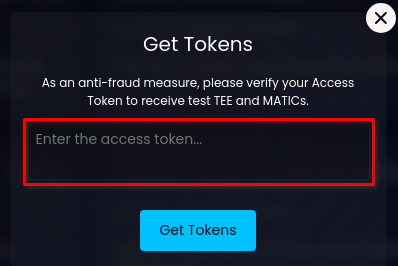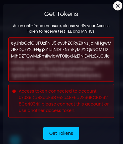 When you request tokens for the first time, the system asks you to enter your Access Token. You can find it in the Testnet invitation letter next to your Testnet Account and Private Key. The Access Token looks something like this: