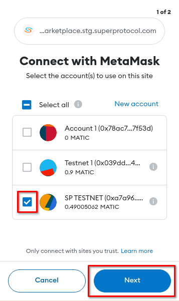 Then open your MetaMask, select your Testnet account, and click Next.