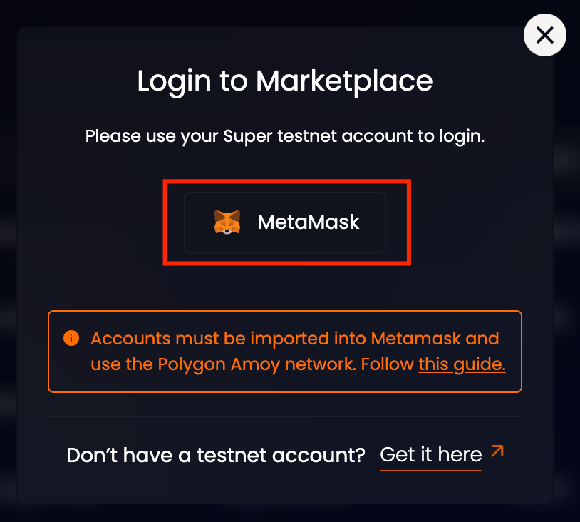 Then, click the Connect Wallet button in the Marketplace GUI again and select the account you configured for Testnet.